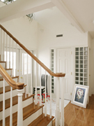 | 白で囲まれた室内に落ち着きを与えるフローリング、そしてアメリカの家庭を想わせるような暖炉。暖炉を据えることで風格漂わせたリビングは、ご家族でくつろげる大切な空間です。洋風の住宅を更に引き立てるフィッツの階段材。熟練した職人の手による「芸術品」とも呼べるこの階段材は、曲線の美しさが優雅な暮らしを演出してくれます。選ばれたタイプは「オーバー・ザ・ポスト」と呼ばれる、柱の上部が手摺りの上に突きでないタイプ。玄関を入ったすぐ左にあるシューズクローゼットのおしゃれなガラスブロックは、クローゼットの中まで外光を届けたいと言うご希望により取り付けました。 |
