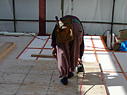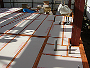 | 基礎工事同様、しっかりとしたそして快適な"家"にするための構造部分の工事です。床に敷き詰める28mm仕様のパネル、そしてスタッドなど、木材はダグラスファーを使用しております。色の付いている部分は妨蟻用の塗装です。もちろん断熱・密閉性を確保するために、ロックウールとベーパーバリアーは必需品です。 |